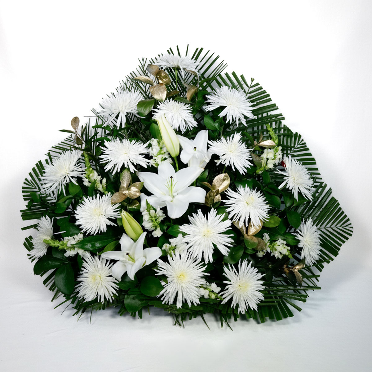 Composición equilibrada con lirios blancos chirosas y toques sutiles de follaje verde oscuro con dorado , transmitiendo serenidad y respeto.