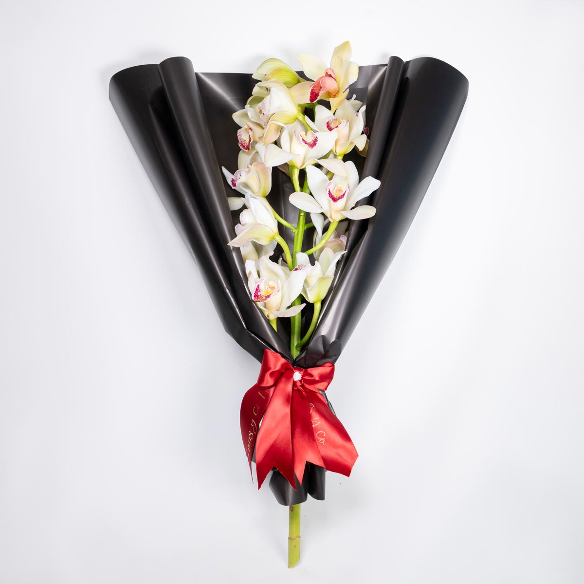 Un bouquet de orquideas simbidium son flores que simbolizan lujo elegancia y amor duradero con su diseño moderno tonos sobrios y lazos delicados cautivan con su belleza y duracion convirtiendiolo en el detalle ideal para aniversarios agradecimientos o momentos unicos.
