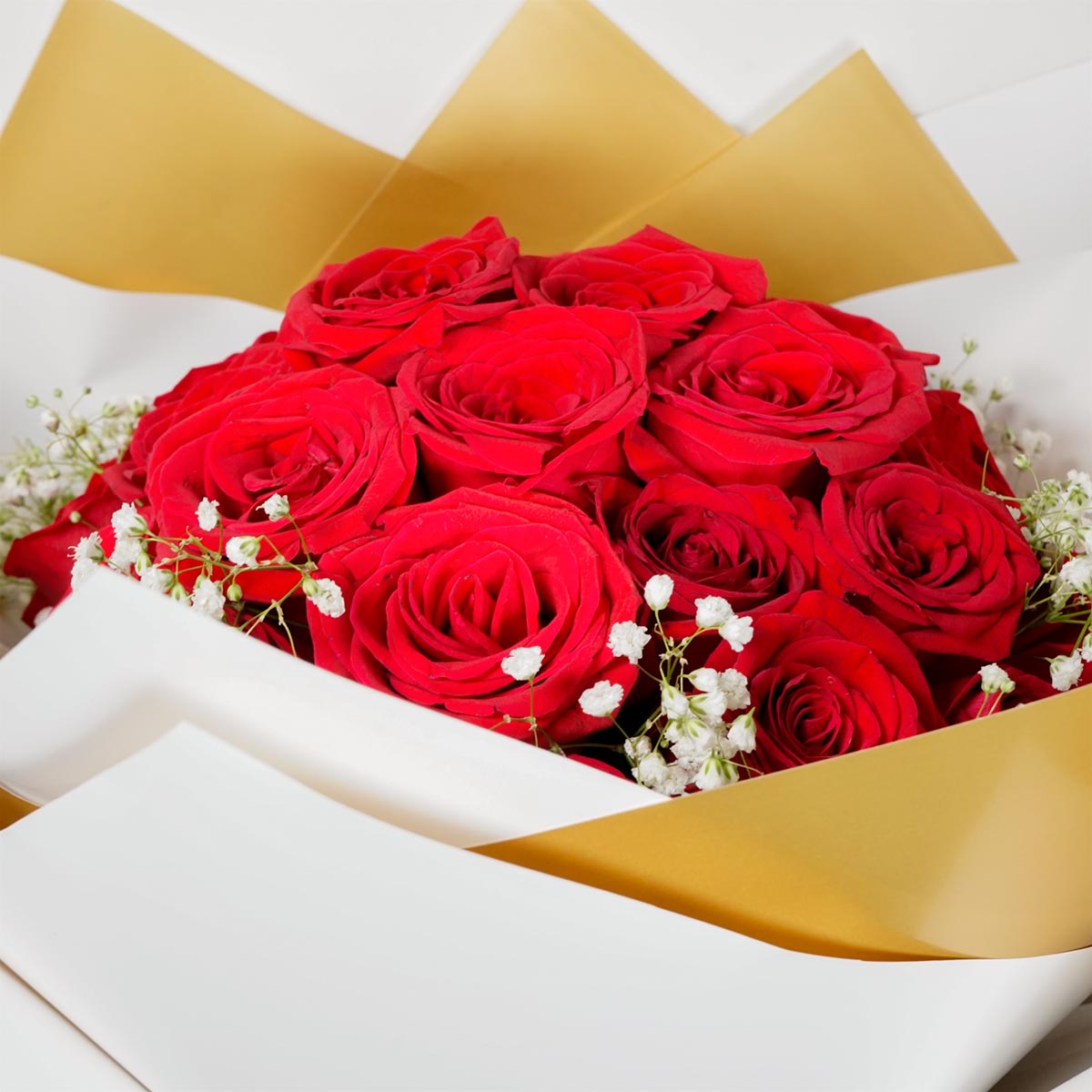 Rosas premium rojas decorado en papel coreano en tonos dorados y blancos, seleccionadas por su tamaño perfecto y duración excepcional.