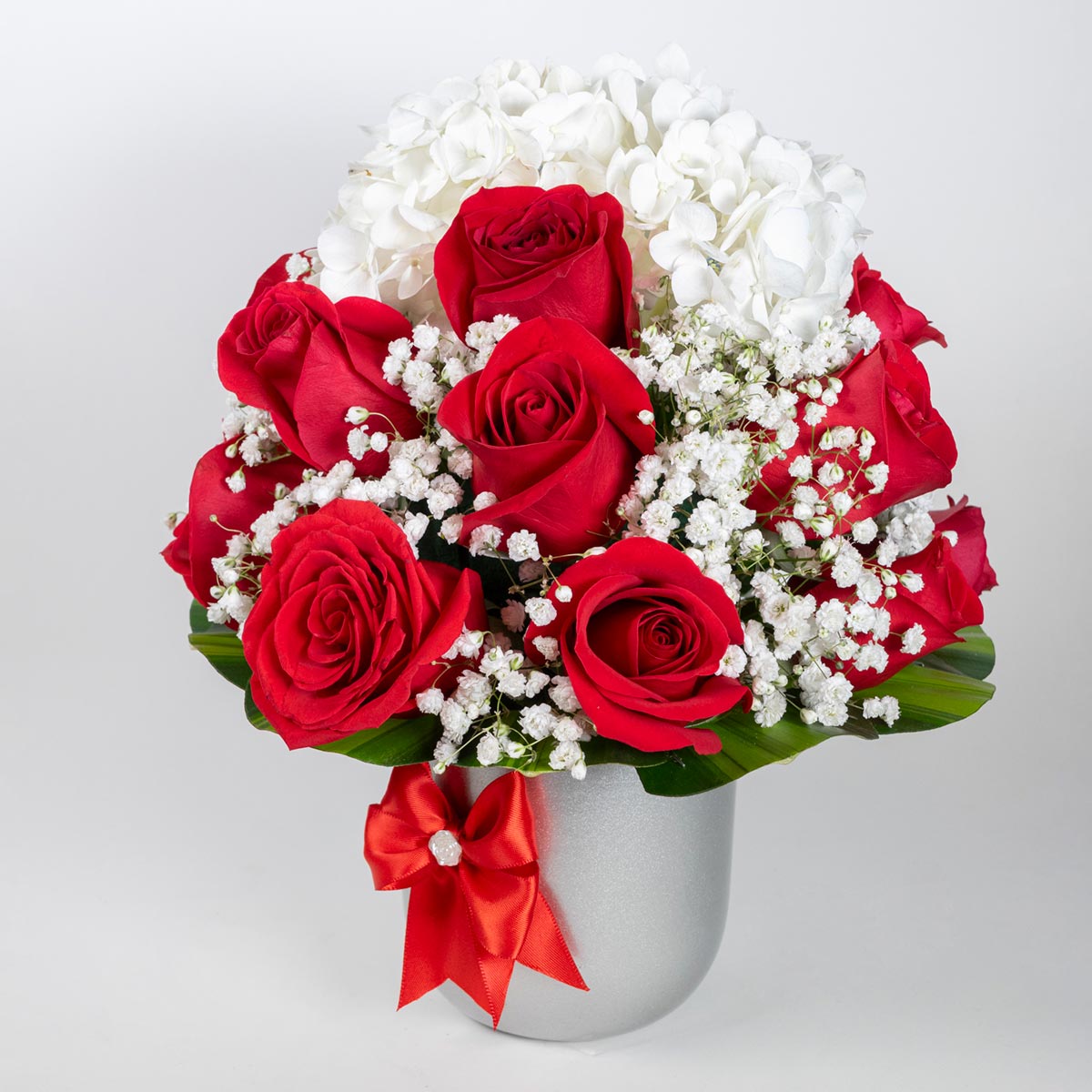 «Pasión y pureza. Este exquisito arreglo une la intensidad de las rosas rojas con la delicadeza de la hortensia blanca, presentado en una distinguida base de cerámica fina con acabado satinado. Más que flores, una declaración inolvidable de amor y elegancia.»