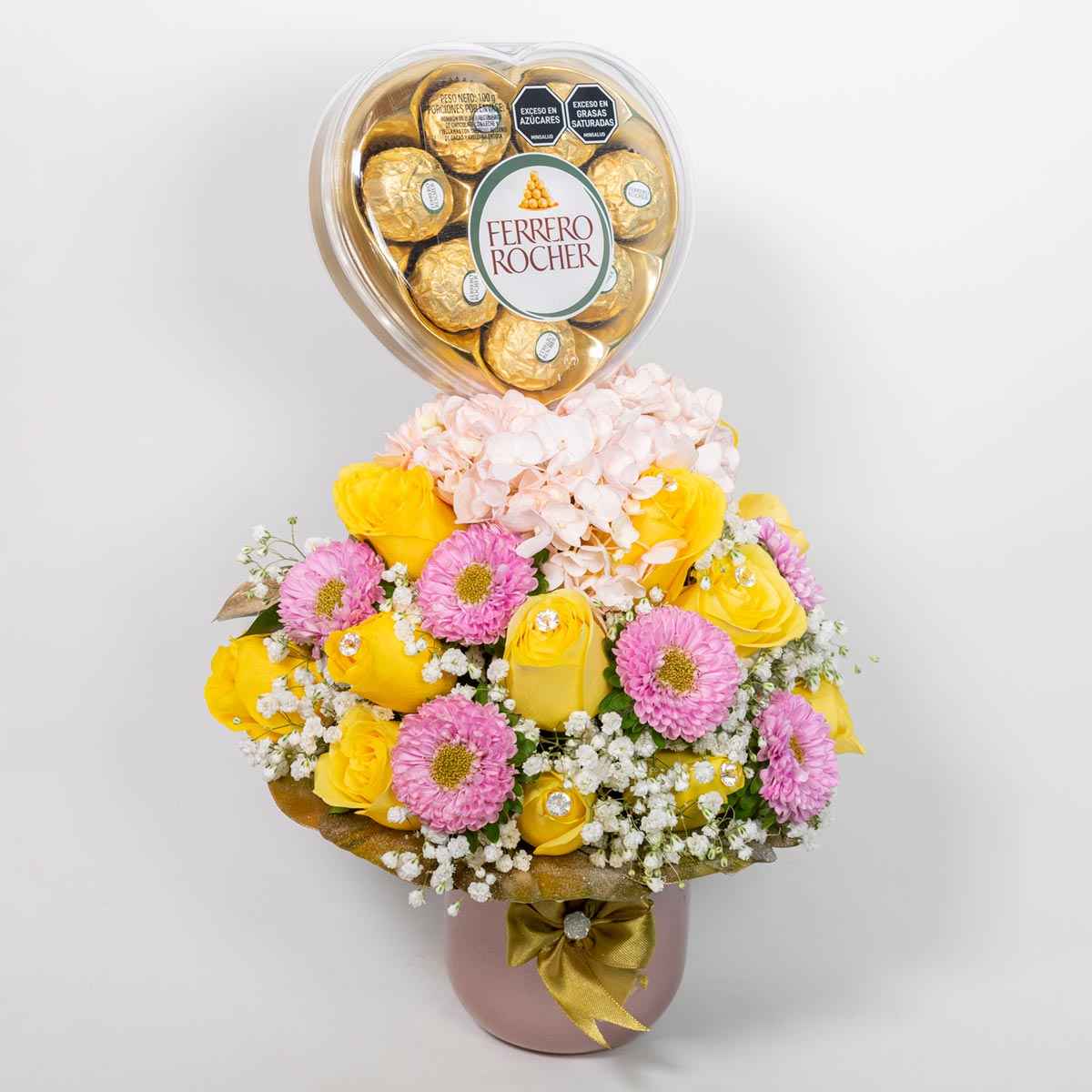 Detalle copito ilumina con encanto y dulzura sus rosas amarillas con destellos en diamantes acompañado de un estuche en forma de corazón Ferrero Rocher detalle perfecto para agradecimientos amor celebraciones especiales o para expresar cariño con un toque de elegancia.