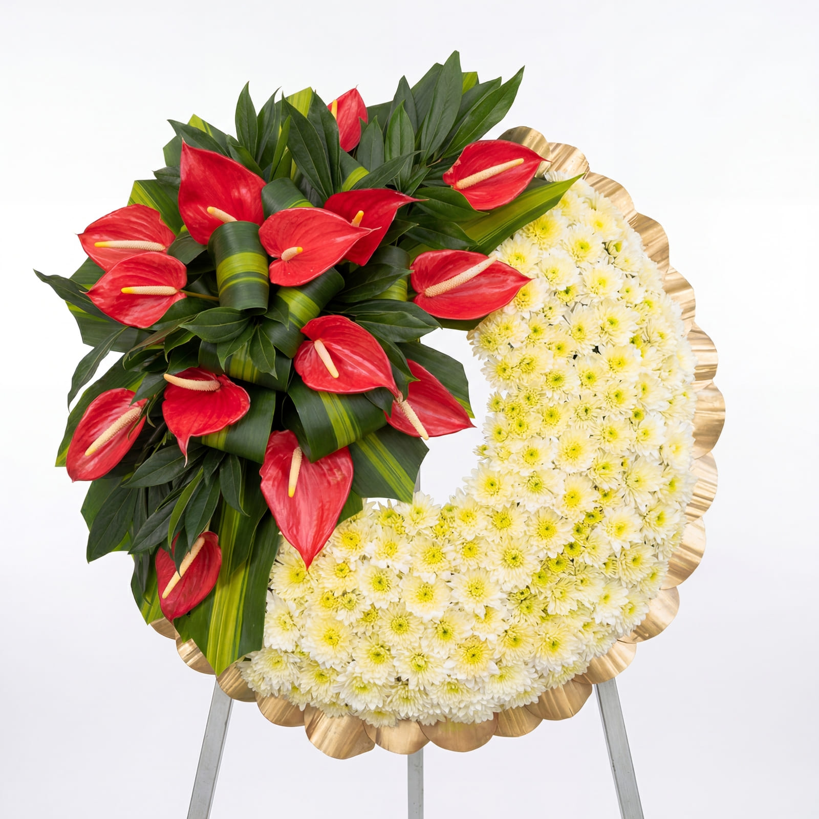 🖤 Composición elegante con margaritas blancas y anturios rojos, acompañados de verdes profundos con un toque de dorado en su contorno que transmiten respeto, paz y consuelo en momentos de despedida. 🕯️