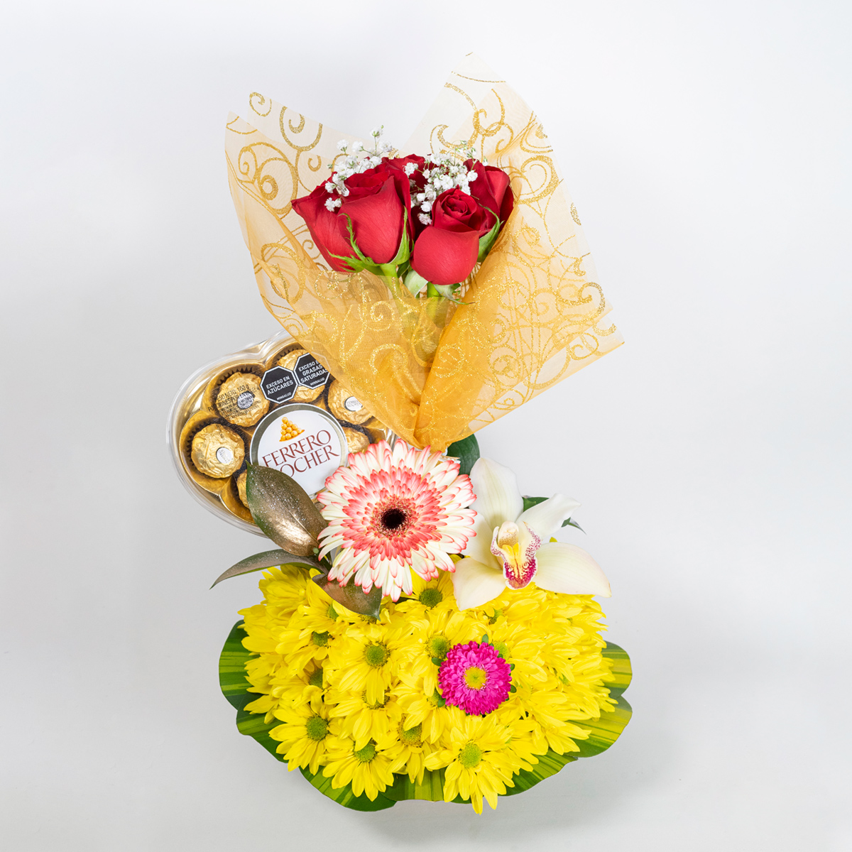 Para esos momentos donde las palabras no bastan, este diseño lo dice todo. Unimos la pasión eterna de rosas rojas selectas—envueltas en un delicado encaje de oro—con la ternura de una orquídea cymbidium y la alegría de margaritas radiantes. Coronando esta joya floral, el toque irresistible de un corazón de chocolates Ferrero Rocher. Es la armonía perfecta entre el brillo, el aroma y la dulzura, creada para hacer sentir a esa persona que es el tesoro más grande de tu vida.