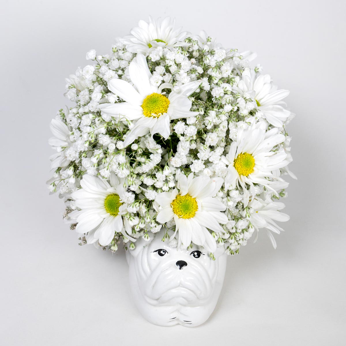 Respeto y consuelo transmitidos con sensibilidad. Diseño sobrio y elegante para expresar condolencias. Flores frescas y duraderas que transmiten paz y apoyo en un momento difícil. Entregado con la puntualidad y delicadeza que merece un homenaje tierno y lleno de paz este delicado arreglo de margaritas blancas simbolo de pureza y descanso eterno se presenta en una base de ceramica de forma de perrito evocando fidelidad y el amor incondicional un detalle perfecto para expresar condolencias y acompañar con cariño a quienes atraviesan un momento de despedida