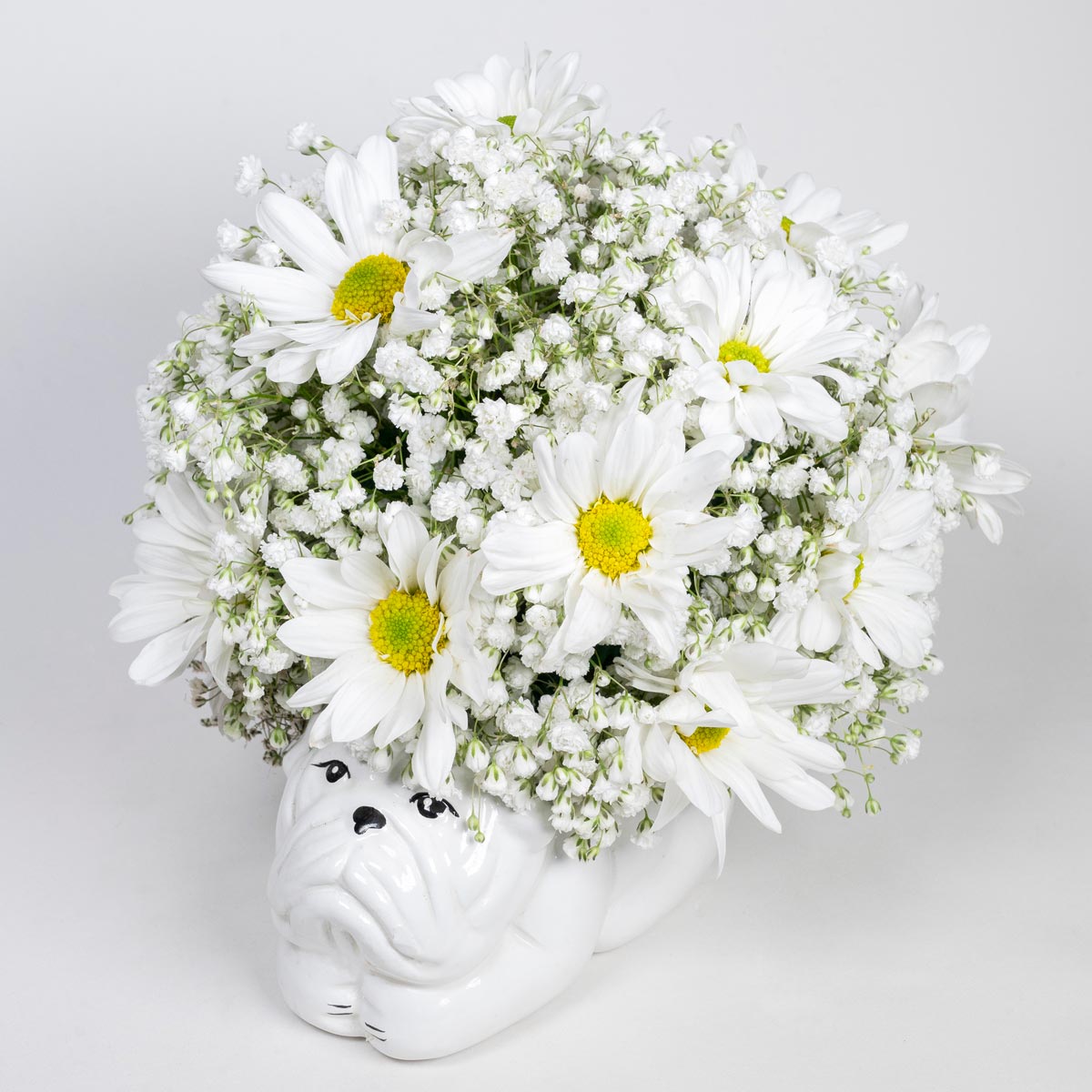 Florero con forma de perrito acostado y margaritas