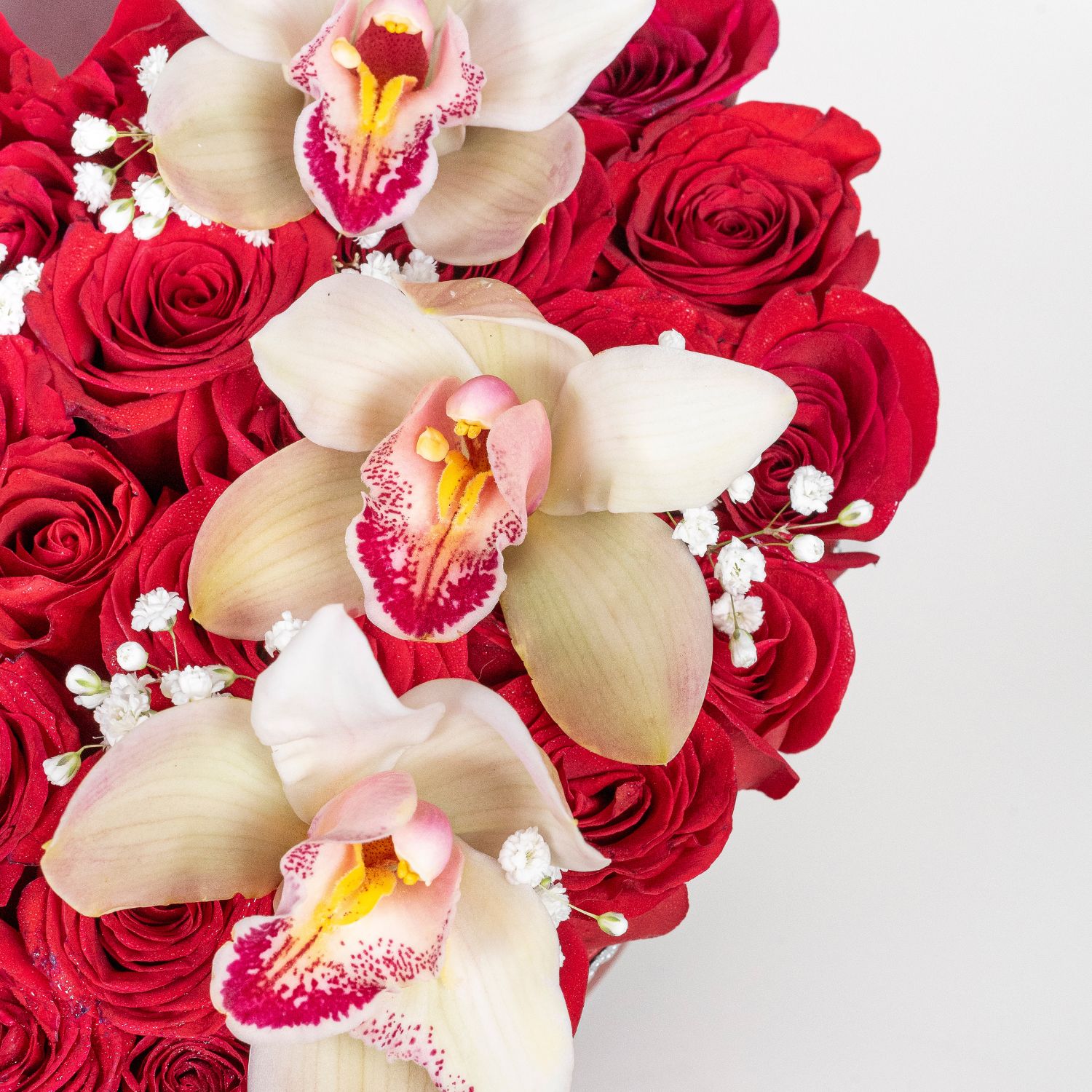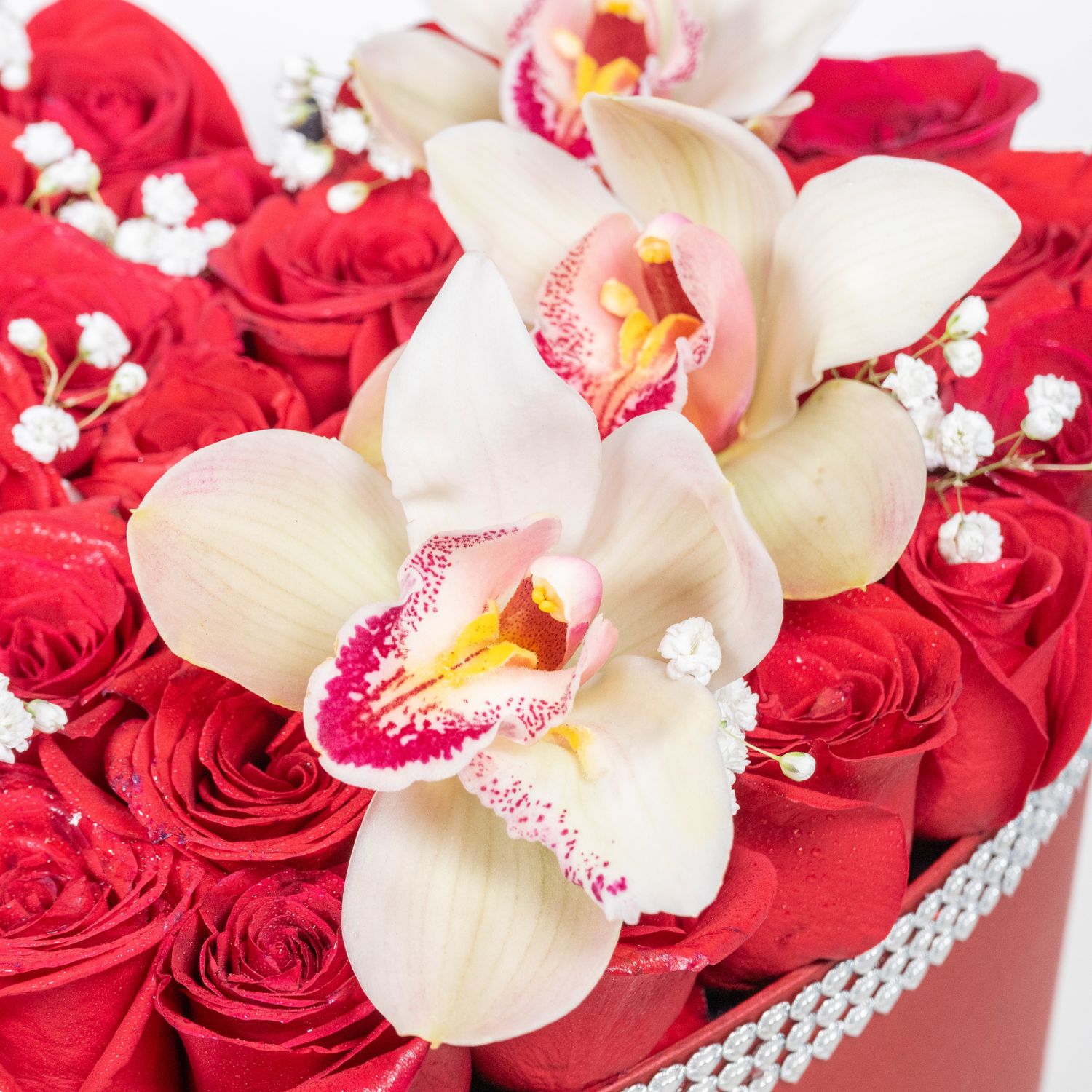 La elegancia natural de la orquídea en un diseño con forma de corazón. Un mensaje de amor refinado y perduable. Garantizamos su frescura y belleza al momento de la entrega sorprende con un detalle que enamora a primera vista eterno amor combina la pasion de las rosas con la delicadeza de las orquideas perfecta para conquistar o celebrar momentos únicos.