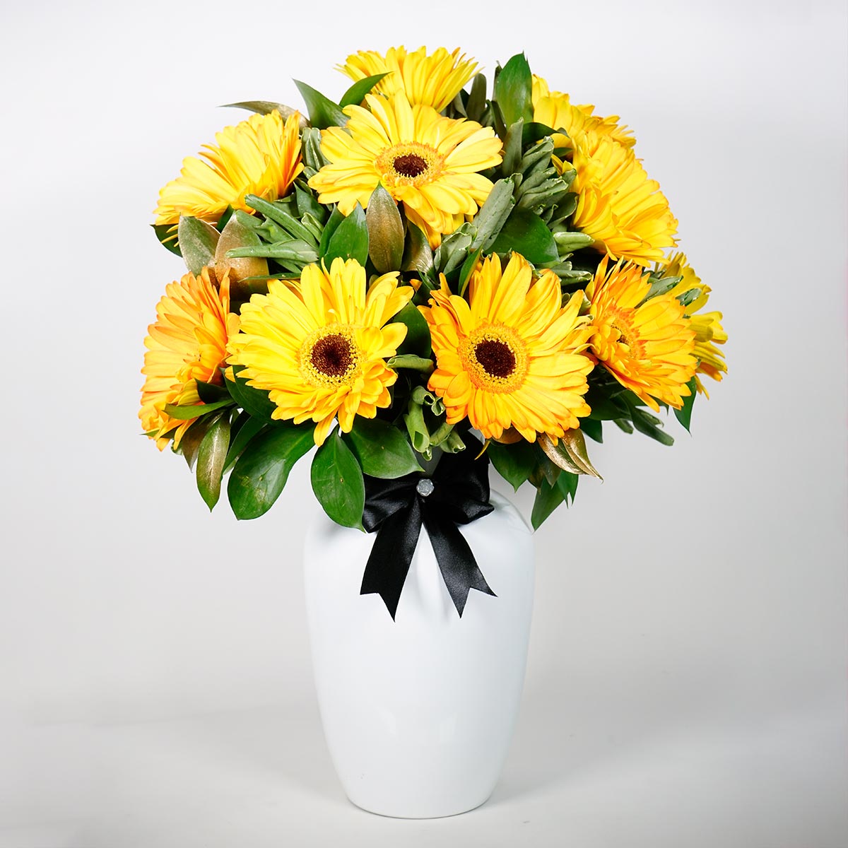 Radiantes gerberas amarillas, frescas y vibrantes, dispuestas en un elegante florero que realza su energía positiva y su belleza luminosa. Cada flor transmite alegría, optimismo y la calidez de los mejores sentimientos.
