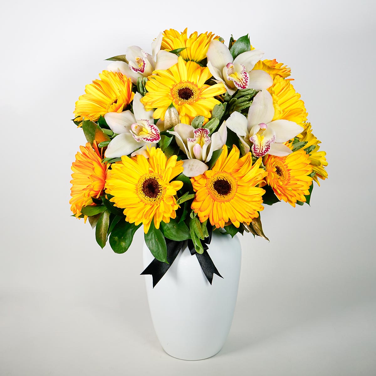 Gerberas vibrantes y orquídeas sofisticadas en un florero que crea equilibrio perfecto. Color, textura y distinción en una sola pieza.