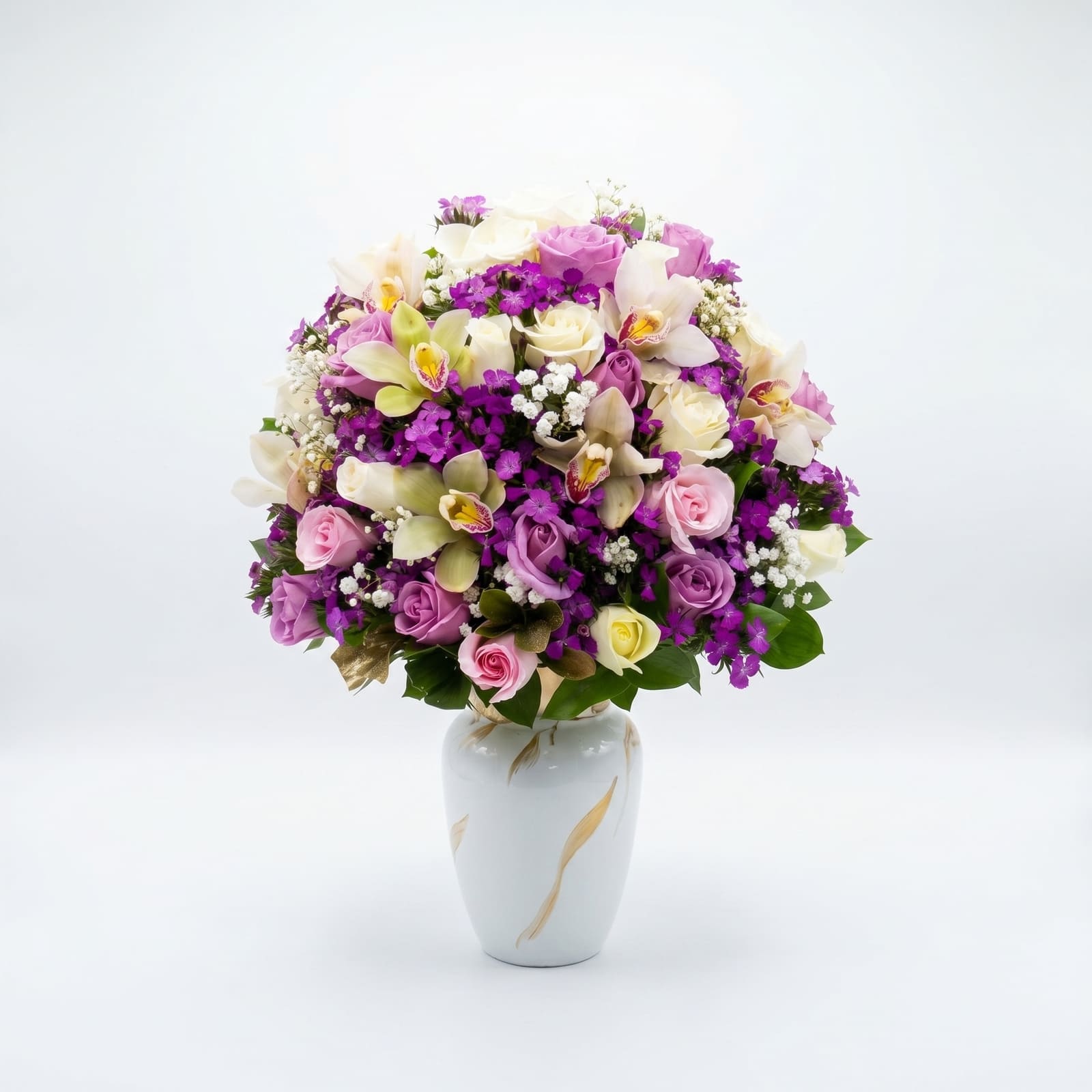 Elegante arreglo floral en jarrón que combina rosas en tonos pastel con delicadas orquídeas y finos detalles de flores pequeñas como el clavel chino en tonos morados y blancos. Su composición armónica y fresca transmite sofisticación, dulzura y equilibrio, creando un diseño lleno de vida y elegancia ideal para espacios especiales.