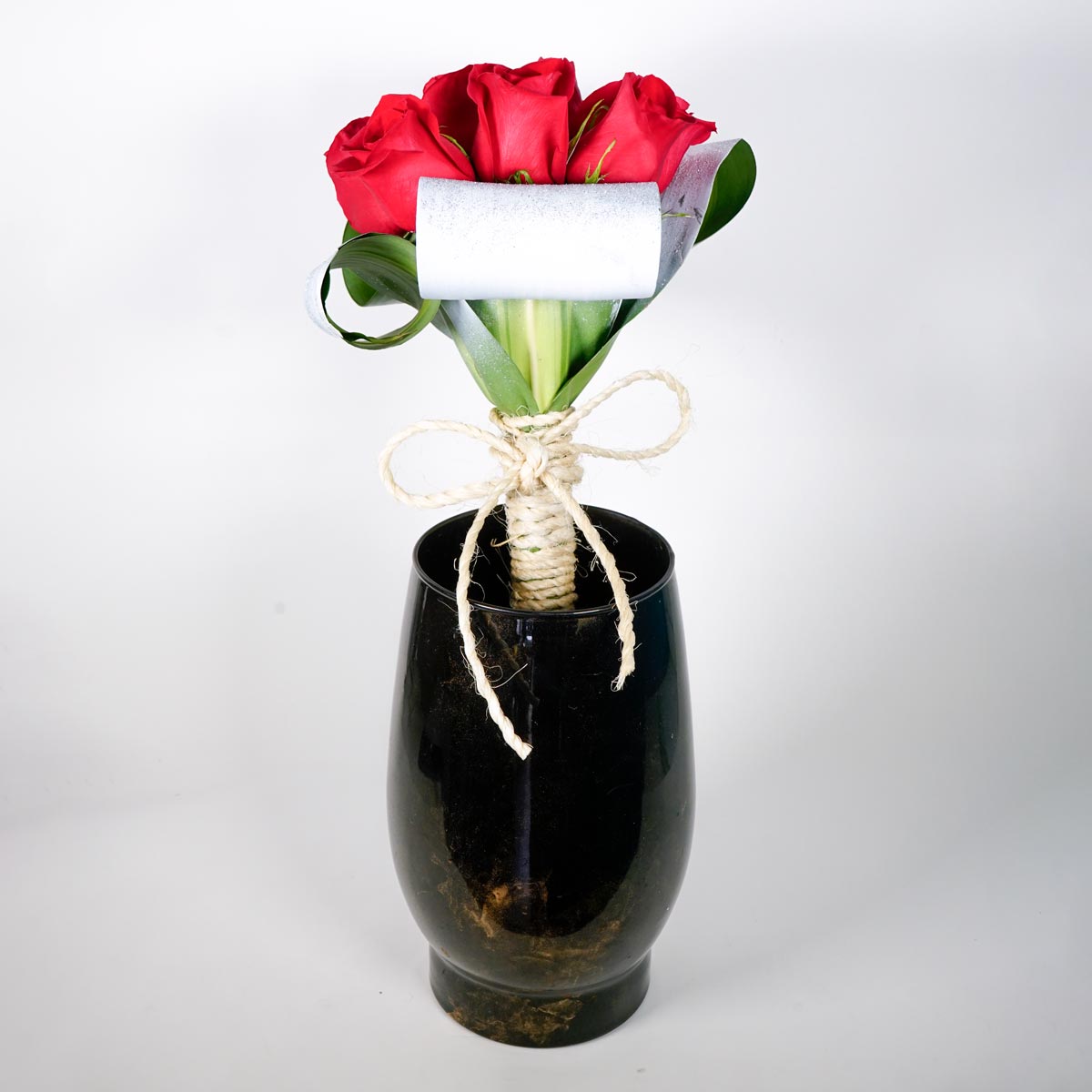 Rosas rojas apasionadas en un jarrón negro que realza su intensidad y belleza. Un diseño audaz, sofisticado y lleno de carácter.