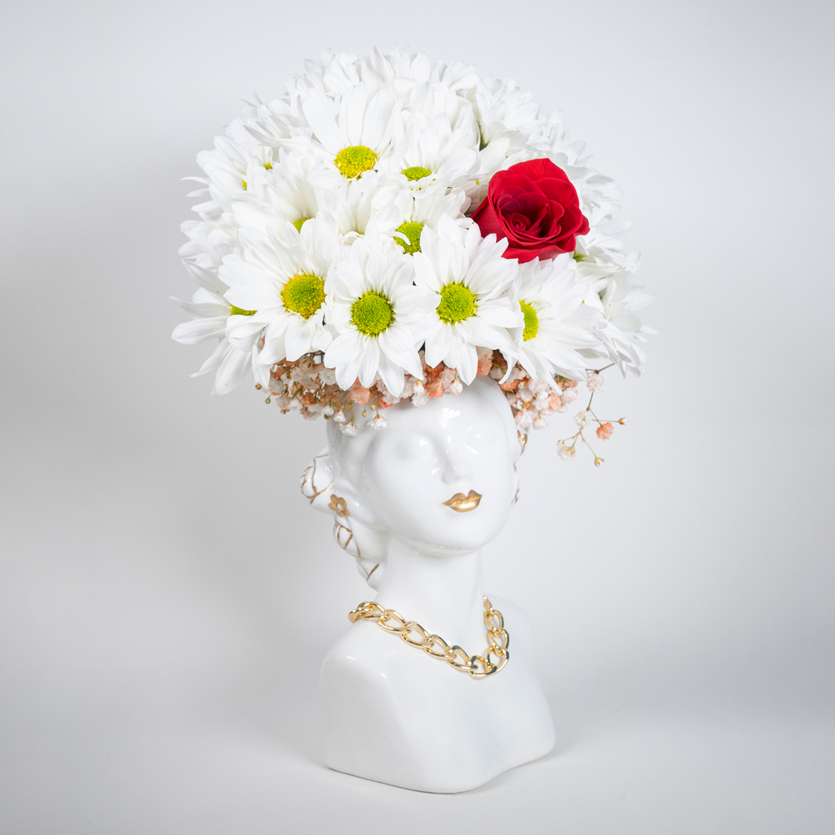 Elegante arreglo floral con sutiles margaritas blancas y un tocado de rosa roja elaborado en una pieza artística en forma de rostro majestuoso que dice eres única ideal para decorar regalar o transmitir emociones con distinción