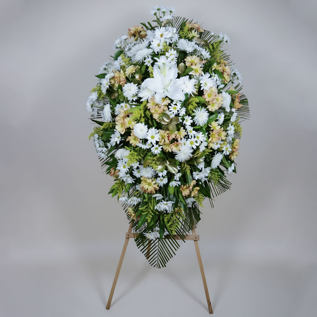 🕯️Diseño de altura clásica una composición equilibrada y solemne, creado con margarita blanca y ocre lirios blancos chirosas blanca ideal para espacios conmemorativos.