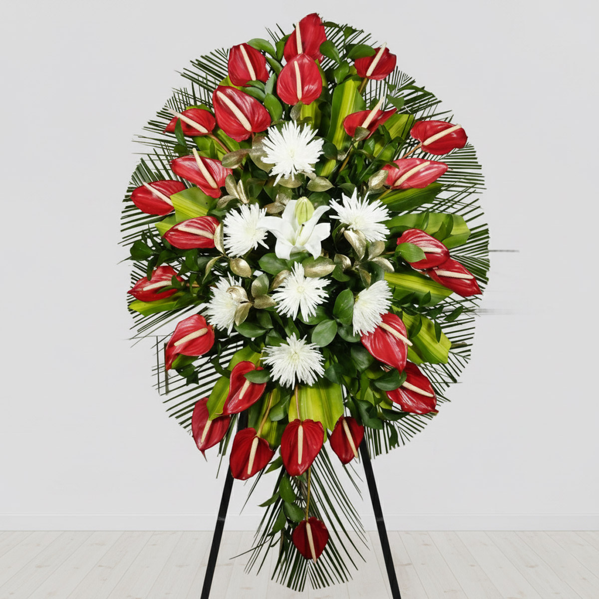 lirios blancos chirosas y anturios dispuestas en armonía solemne.🕯️