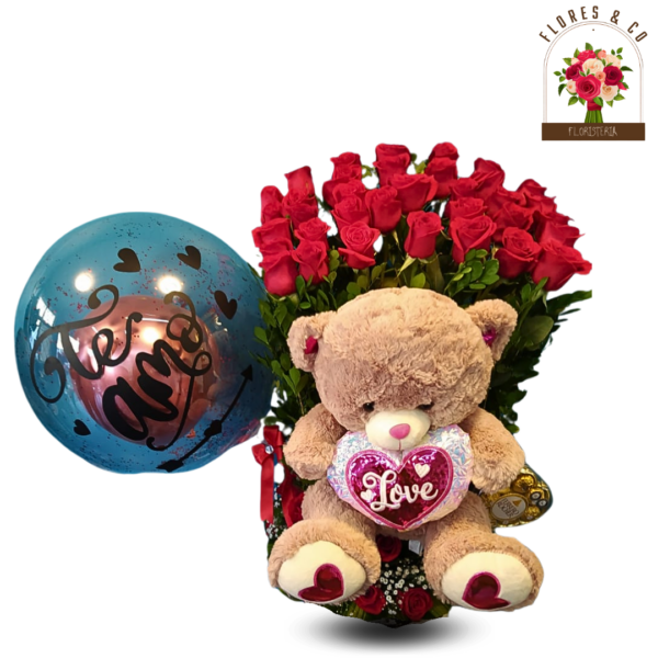 Déjate cautivar por nuestro diseño exuberante, una combinación perfecta de flores frescas, un globo personalizado y un adorable peluche, creando el detalle ideal para transmitir amor, alegría y ternura.